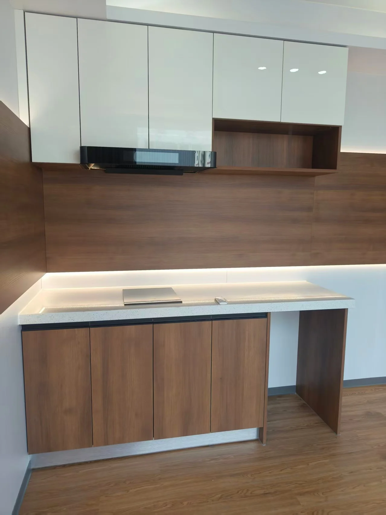 Quartz stone countertop. solid wood painted cabinets. hanging cabinets + built-in induction cooker or customized
