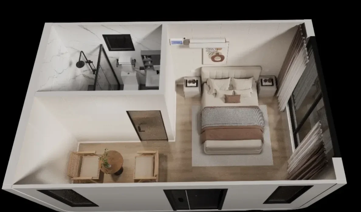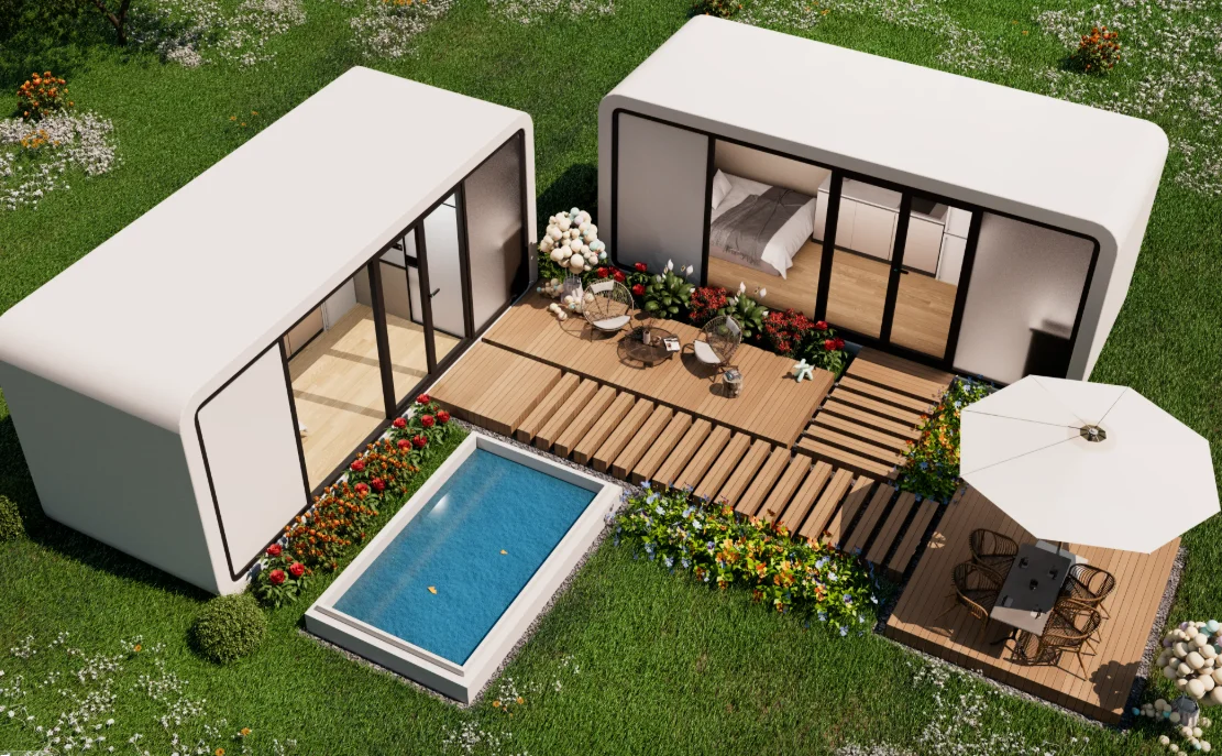 The interior space layout of the Apple Cabin is compact and flexible. It often adopts a simple and modern design style. optimizes space utilization through functional zoning. and is equipped with movable furniture. combining practicality and comfort.